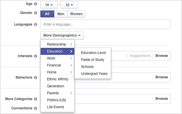 You can target people who are already connected to your Facebook page or connected to another of your pages. You can also target ads only to people who aren’t online yet; therefore your ads won’t show to your existing followers. You can locate friends of people you are already connected to your home page.